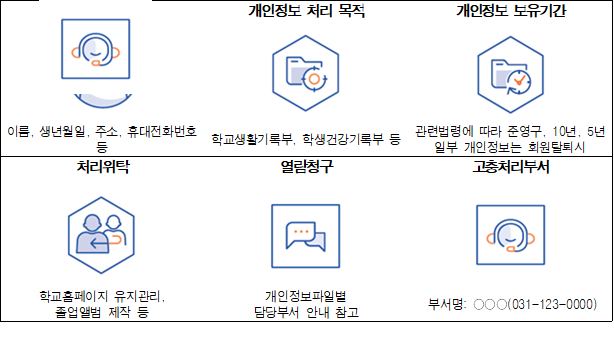 스쿨뱅킹 (CMS)정보 | 수납금 처리 | 정보주체 동의(학생정보,학부모 계좌정보) | 학생(학년, 반, 번호, 성명), 보호자(성명, 은행명, 생년월일, 연락처, 계좌번호) | 5년 |